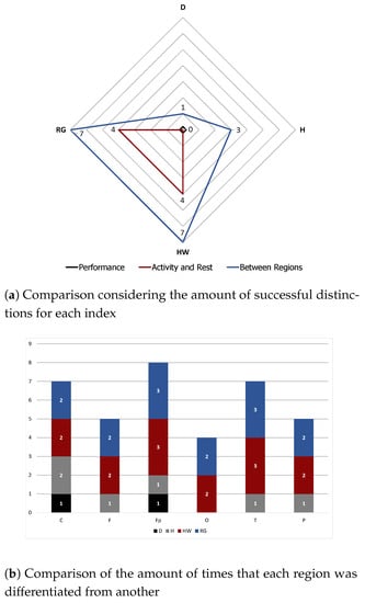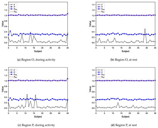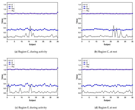 In this subsection, we examine the time-domain analysis of the EGG signals, aiming to extract information oblivious to the PSD results. The indexes calculated, namely the differentiation order, the Hurst index, and the Hall–Wood and the Robust–Genton fractal dimensions, are graphically presented in Figure 8 and Figure 9 for all six brain regions studied in the paper. While the first figure presents the indexes for brain regions C, F, and Fp, the second shows regions O, P, and T. One might notice that the indexes are presented by means of pairs of plots, where data from the activity dataset are on the left and data pertaining to subjects at rest are on the right side.