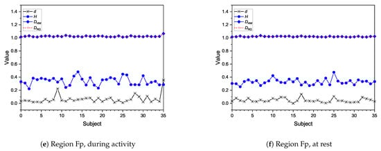 Fractal measures comparing the activity (left) and rest (right) datasets for all 36 patients according to brain region: (a,b) region C, (c,d) region F, and (e,f) region Fp.
