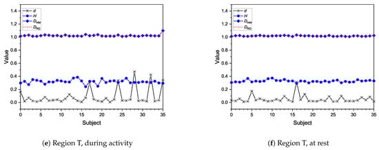Fractal measures comparing the activity (left) and rest (right) datasets for all 36 patients according to brain region: (a,b) region O, (c,d) region P, and (e,f) region T.