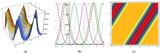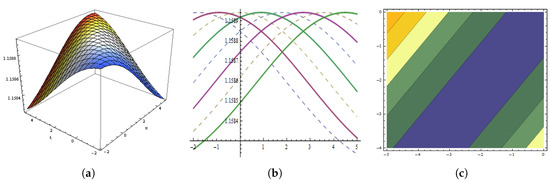 Figure 2. The graphical behavior of the Υ ( x , t ) in Equation (32) at α = 0.31 , a = 0.5 , b = 0.72 , c 2 = 0.42 , λ = 0.81 , ϑ = 0.19 , ϕ = 1.2 , v = 0.5 , δ = 1 , w = 0.2 , Ω = 0.1 . (a) Represent three dimensions. (b) Show two dimensions. (c) Represents contour figures.