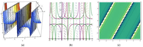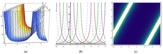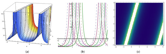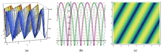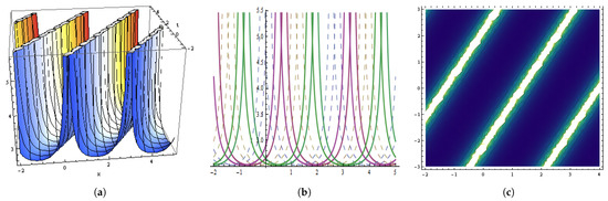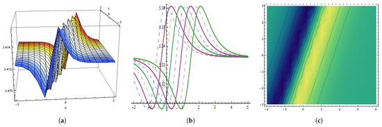 Figure 18. The graphical behavior of the Υ ( x , t ) in Equation (129) at α = 0.14 , a = 0.15 , b = 0.25 , c 2 = 0.43 , λ = 0.43 , ϑ = 0.12 , ϕ = 1.8 , v = 1.4 , δ = 1 , Ω = 0.1 . (a) Represent three dimensions. (b) Show two dimensions. (c) Represents contour figures.
