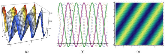 Figure 20. The graphical behavior of the Υ ( x , t ) in Equation (150) at α = 0.42 , a = 0.22 , b = 0.02 , c 2 = 0.13 , λ = 0.25 , ϑ = 0.17 , ϕ = 1.5 , v = 0.3 , δ = 1 , Ω = 0.1 . (a) Represent three dimensions. (b) Show two dimensions. (c) Represents contour figures.