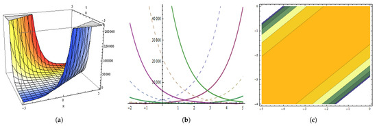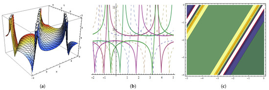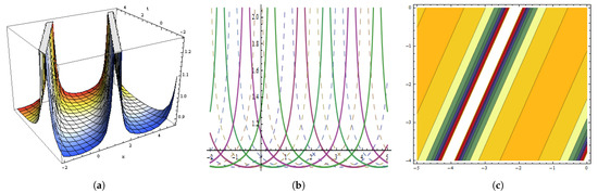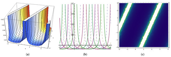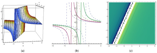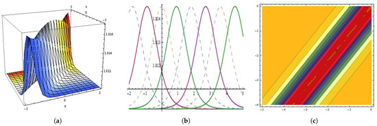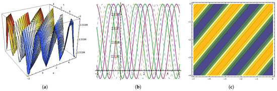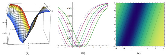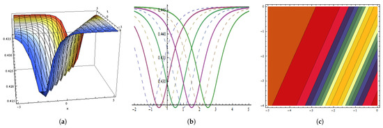 Figure 16. The graphical behavior of the Υ ( x , t ) in Equation (123) at α = 0.24 , a = 0.45 , b = 0.15 , c 2 = 0.43 , λ = 0.3 , ϑ = 0.2 , ϕ = 0.5 , v = 0.3 , δ = 1 , Ω = 0.1 . (a) Represent three dimensions. (b) Show two dimensions. (c) Represents contour figures.