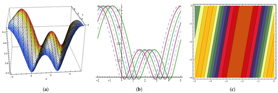 Figure 9. The graphical behavior of the Υ ( x , t ) in Equation (81) at α = 0.34 , a = 0.4 , b = 0.5 , c 2 = 0.44 , λ = 0.85 , ϑ = 0.6 , ϕ = 0.4 , v = 0.2 , δ = 1 , w = 5.5 , Ω = 0.5 . (a) Represent three dimensions. (b) Show two dimensions. (c) Represents contour figures.