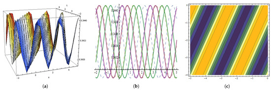 Figure 3. The graphical behavior of the Υ ( x , t ) in Equation (39) at α = 0.314 , a = 0.2 , b = 0.78 , c 2 = 0.43 , λ = 0.815 , ϑ = 0.17 , ϕ = 1.525 , v = 0.58 , δ = 1 , w = 0.3 , Ω = 0.1 . (a) Represent three dimensions. (b) Show two dimensions. (c) Represents contour figures.