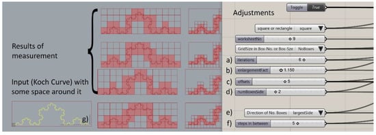 After calling the appropriate Grasshopper® program, the user selects the object under consideration in Rhinoceros® and assigns it. For performance reasons, the authors recommend grouping all relevant objects. With the definition of the bounding box, the program also calculates the shortest side. Then follows, depending on the user selection (see (e) in Figure 1), the subdivision of the smallest side or of the x-parallel side into the specified number of boxes (“numBoxesSide” (d) in Figure 1). The subdivision of the other side results from the approximation of square boxes. Regarding the following iterations (number of divisions; “iterations” (a) in Figure 1), exactly dividing each box into quadrants means recursively considering only those boxes that have already covered a piece of the object. This speeds up the algorithm as smaller grid sizes do not examine empty boxes anymore. Dividing the distance between the two largest box sizes by the number of “steps in between” (see (f) in Figure 1) results in the additional starting grid sizes. To achieve better accuracy of the measurement, the program adds an empty space around the object in a further step. The empty space corresponds to the difference resulting from a multiplication of the smallest side of the bounding box with the factor “enlargement” (see (b,g) in Figure 1). This also enables different starting positions of the grid, while at the same time maintaining the absolute size and completely covering the object. With only two offsets (see (c) in Figure 1), the lower-left starting point results from the fact that the grid still has to cover the upper right corner of the object (its bounding box). The same applies to the other three corner points. Consequently, two offsets result in four (2 by 2)-starting positions. In the visualization, the iterations are in the horizontal direction while the offsets and intermediate steps are in the vertical direction. In addition to the before-mentioned parameters, the user defines the worksheet number of an open Excel sheet into which to write the result.