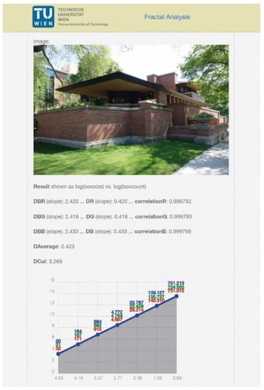 The above-mentioned color analysis methods, which form the basis for the mobile phone application FRACAM, are particularly aimed at measuring correlations with results of the extended measurement methods for color photos. In [] several series of measurements were carried out, including the Robie House, whereby no correlation could be found between the fractal dimension and the mean color value, the predefined color areas, the saturation or the brightness. From this, it can be inferred that apparently the color of an image does not influence the result to an extent as significant as the shapes of the objects under scrutiny, i.e., the building and its surroundings.