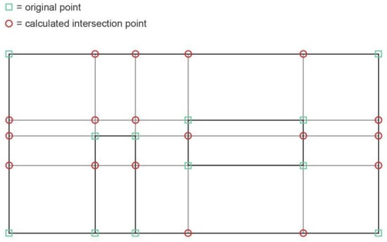Deep gradient analysis: To take all areas e.g., of a façade of a building represented by a list of coordinates into consideration, all intersection points on an orthogonal grid which can be derived from the original coordinate list are calculated. This includes e.g., the proportion of an area between a window and the edge of a façade (see Figure 3).
