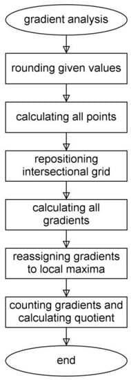 - counting the remaining gradients and forming the quotients of the number of remaining gradients and the possible number of connections based on the original coordinate list as well as the list of all points on the intersectional grid.