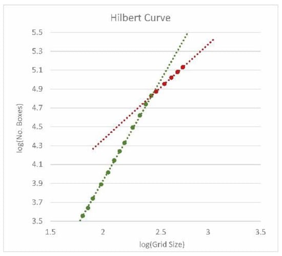 - There are two clearly separable intersecting straight segments, with different gradients. Accordingly, a range with larger boxes can lead to higher fractal dimensions, followed by a section with a smaller fractal dimension.