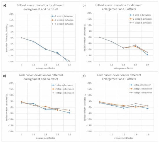 With this knowledge, the authors tested the influences of different enlargement factors against changing intermediate steps. This confirmed the trend from before, in which the deviation increases with the degree of magnification. It was also observed that intermediate steps only partially improve the results (1 × 1, 2 × 2 and 4 × 4 steps in between were considered; Figure 7a,c: compare single columns, which include different enlargement factors). Figure 7 also shows that the influence of the enlargement factor is in any case higher than the influence of intermediate steps. This holds true for fractal curves of higher fractal dimension (Hilbert Curve with a fractal dimension of 2.0) and those with a lower dimension (Koch Curve with a fractal dimension of 1.26). The next step was an analysis with the same settings, but with 3 × 3 additional offsets (Figure 7b,d). This led to slightly better results, especially for curves with a fractal dimension above 1.5–it had a greater effect on the higher enlargement factors, which otherwise led to larger deviations (compare corresponding columns of different enlargement factors in Figure 7a,b).