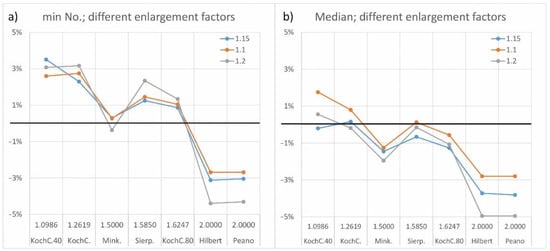 The pre-defined settings, including variations for the enlargement factors of 1.1, 1.15 and 1.2%, show a clear trend. While fractals with a small fractal dimension close to = 1 (self-similar dimension) almost reach or only slightly exceed the calculated value, fractals with a high fractal dimension deviate more clearly from the expected value. In addition, the latter fall below the value in any case. It also shows that these observations hold true for both the median and the calculated average value (Figure 8a). The measured value (), which considers the smallest possible number of covered boxes, shows a similarly high positive deviation (by +3%) for fractals with low self-similar dimensions, as show a negative deviation (by −3%) for fractals with high values (Figure 8b). In any case, the enlargement factors of 1.1% gives the most accurate results for all fractals in the test series. Since analyzes of façades only rarely exceed the value of 1.7 or fall below 1.3, the following measurements will use an enlargement factor of 1.15%, and above all the median is considered. This also corresponds more precisely with the statistical analysis of accuracy as shown by the quartiles.