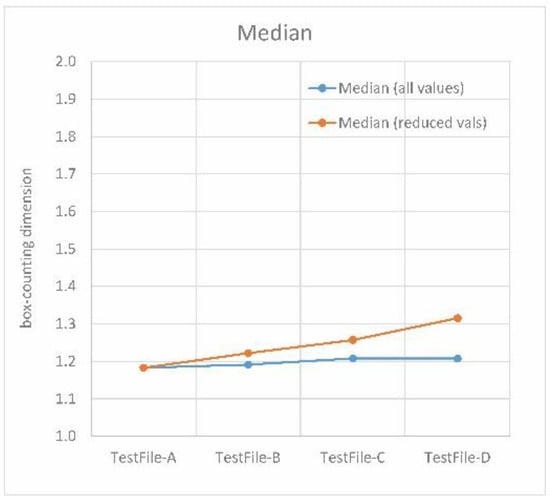 The box-counting implementation presented here also takes the smallest number of covered boxes for each grid size for the first time into account. This means that for each grid size and its varying positions (due to displacement) the smallest number of covered boxes is noted for a separate calculation. First results show a good approximation regarding the medians (Figure 17). In future work, this will be an additional parameter that should be taken into account.