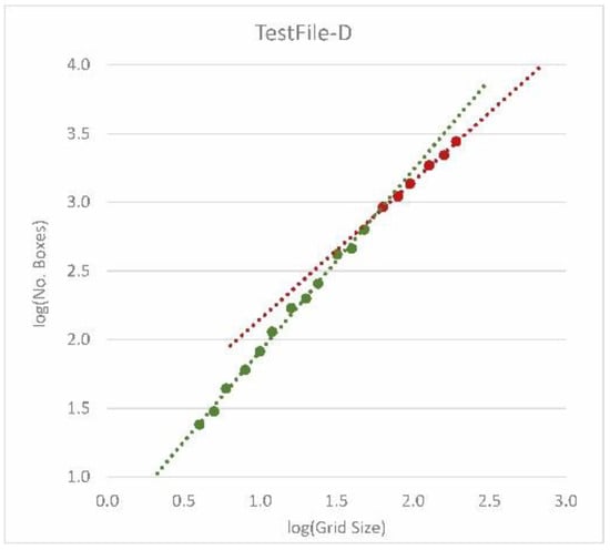 Other influencing factors derive directly from the method of analysis, including the initial size of the grid, given by the largest box-size. Fourtan-Pour et al. [] define this size, in general, as one fourth of the smallest side of the object, while one third is sufficient for less complex structures. The smallest box size, in turn, is identical to the scale at which the data points in the double logarithmic graph approaches a slope of 45 degrees. This corresponds to the point after which only separate one-dimensional lines are in focus. Another influencing factor concerns the reduction factor from one grid size to the consecutive smaller size. In the literature, this is often a reduction by half. This leads to large gaps between the individual measurements, especially with larger box sizes. The implementation presented here considers this and allows smaller reduction factors as well. Finally, the empty area around an object also influences the result. This area makes it possible to move the grid and thereby reduce the influence of the starting position in relation to the measured object. This also prevents counting a straight line of a vector graphic that lies exactly on the borderline between two boxes twice; this is important because the method requires the smallest number of boxes to cover the object.