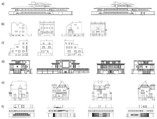 Analyzed buildings without scale: (a) Robie House, street view with and without window design, FL Wright, 1908, (b) House Steiner, north, east, south, west view, Loos, 1910, (c) House Scheu, north, east, south view, Loos, 1913, (d) Villa Schwob, north-east, north-west, southeast, south-west, Le Corbusier, 1916, (e) House Mandl, Loos, north, east, south, west view, 1916, (f) Villa Savoye, north, east, south, west view, Le Corbusier, 1928.