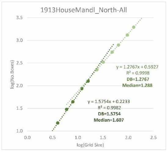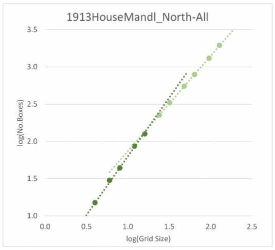 A similar roughness across scales, as an indication of (statistical) self-similarity, manifests itself in a similar fractal dimension for the whole and its parts []. As described above, there are different approaches to defining the fractal dimension and accordingly, different measurement methods. Since its first application in architecture, it turned [,] out that, the box-counting method works well in this field, especially on façades [,]. One advantage of this method lies in the measurability of non-fractals.