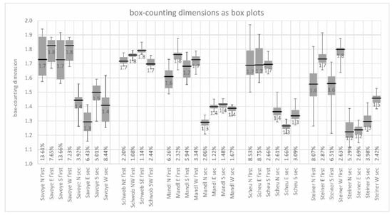 As Figure 14 indicates, there are clearly different variations in the series of measurements. The percentage at the bottom of the chart gives another indication of the variation; it is the sum of the two middle quartiles (the interquartile range) in relation to the maximum dimensional value of two. A very high variance (percentage) indicates a less meaningful result. This applies, for example, to the north facade (both sections) of the Villa Savoye. In comparison, all second sections of House Mandl and House Steiner show less variation. In these cases, moreover, the box-counting dimensions are similarly high and by that indicate a similar roughness in this range. If, on the other hand, one looks at the first sections of the House Steiner, there are similarities between the north and south façades or the east and west façades, with the former showing a lower median than the latter.