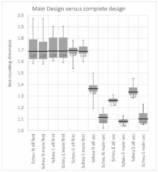 As mentioned before, for interpretation of the results, a box plot of all is an indication for the accuracy and the scattering respectively of all box-counting dimensions of a series of measurements. Figure 14 shows the results, with the range under consideration divided into two different straight-line sections (referred to as “first” and “sec”). As can be seen, the median of the first section (the range of larger box sizes) is always higher than the second one. This corresponds to the endeavors of classical modernism to consciously dispense with ornamentation on a smaller scale.