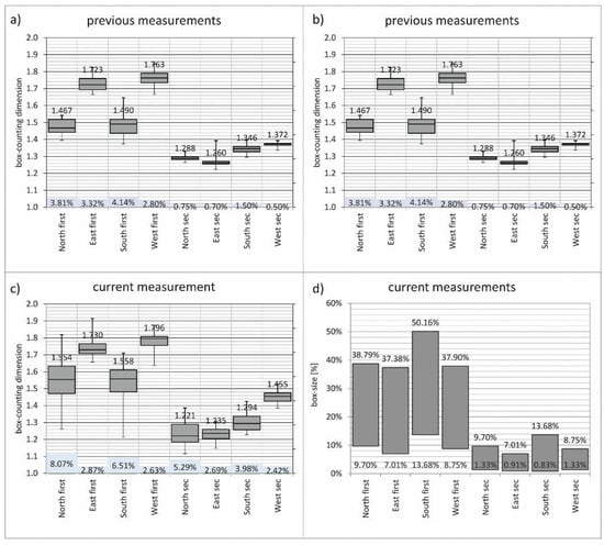 Figure 16 shows a comparison of previous measurements for House Mandl (Lorenz 2014) with those under usage of the program presented here. As can be seen from the figure, all results provide similar values for the same range of box sizes (see Figure 16 right; box size given as a percentage of the height), both in the median and in the box plot (see Figure 16 left).