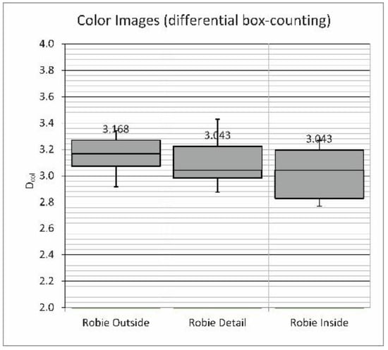 The measurement with the differential box-counting method (the measurement of color images with FRACAM) leads to fractal dimensions approximating the value three. The interpretation of the measurement is carried out in accordance with the 2D calculation in a box plot diagram. This time the analysis includes several camera positions around the building (or inside) that provide different values, but within close range (Figure 18). Even if no connection between color and fractal dimension could be established so far [], the influence of different weather conditions should be examined, which is a task for future work. In the meantime, it is recommended that only pictures taken on the same date and time be included in a calculation. Figure 18 shows such a result for Robie House.