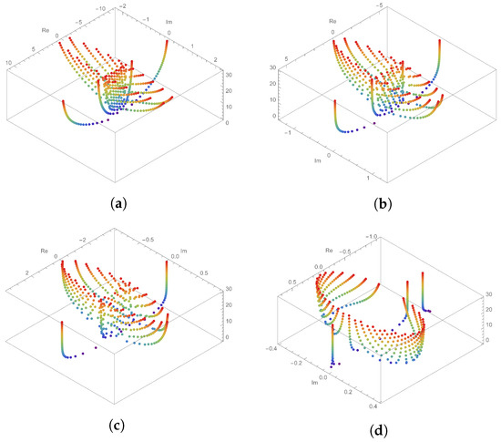 Here, we can see the structures of the approximation roots shown by varying q, as shown in Figure 1. Let us fix , and . The upper left figure (a) in Figure 1 shows the structure of approximation roots under . The upper right figure (b) is when . The condition of the figure on the lower left (c) is and the condition of the figure on the lower right (d) is . Figure 1 shows when fixed at , and it can be inferred that the structure of approximation roots changes from oval to circular form as q becomes smaller. It can also be seen that the number of real roots among the approximation roots decreases as q becomes smaller.