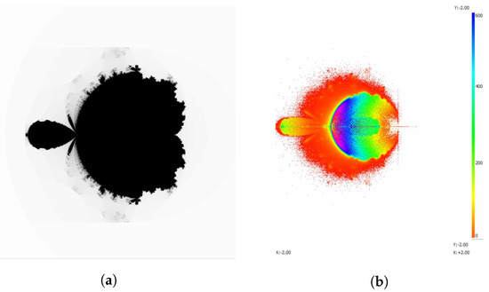 The Madelbrot set and accumulated map of iterating 128-times. (a) Mandelbrot set of ; (b) accumulated map of .