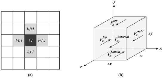 (a) A cell (i,j) and its von Neumann neighbours for cellular automaton discretization. (b) neighbor forces and the external force acting on cell (i,j).