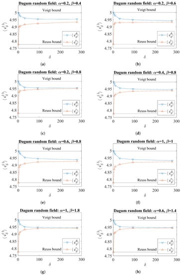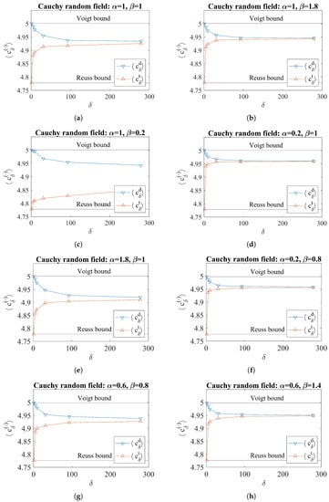 The mesoscale apparent shear modulus responses for the case of Cauchy random fields are shown in Figure 2. It can be observed that for all , the inequalities of Equation (10) are satisfied. The mesoscale, , at which the values of and approximately converge is within the range of values considered for all , except for when . For the cases with and varying , the at which convergence occurred increased as the value decreased. For the case with and varying , the values at which convergence occurred for the cases with and are similar and are far greater than that for the case with . Note that a higher indicates a lower fractal dimension and a higher indicates a lower Hurst parameter and vice versa. These results qualitatively suggest that the at which convergence occurs increases as the Hurst parameter increases. Similarly, the at which convergence occurs increases as the fractal dimension decreases.