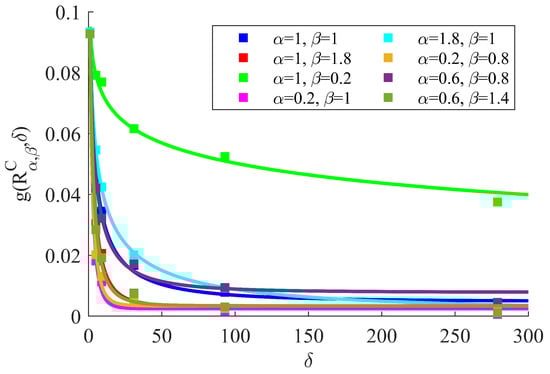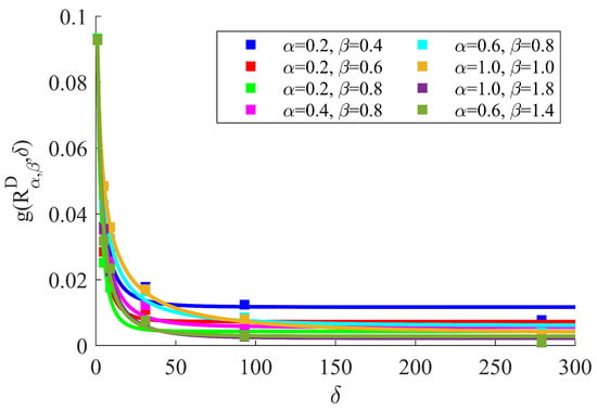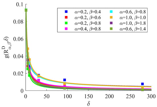 The apparent shear modulus responses, and , were obtained after applying CA for a large number of random field realizations corresponding to each . The number of realizations was increased until the mean and the standard deviation of the apparent shear modulus responses did not change considerably with a further increase in the number of realizations. For all , the ensemble average of all the realizations was set to 5, and the standard deviation was set to 1. After obtaining the apparent shear modulus responses, the scaling data were calculated for all using Equation (14). Then, a stretched exponential fit to the scaling data was employed following the studies conducted in [,]: