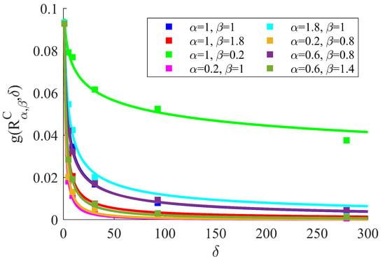 Different combinations of and in Cauchy and Dagum random fields. (A, B, C), (, , ), and (, , ) are the coefficients in the stretched exponential, the Cauchy function, and the Dagum function, respectively. , , and are the error sums of the squares corresponding to the stretched exponential and Cauchy and Dagum functions’ fits, respectively.