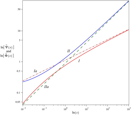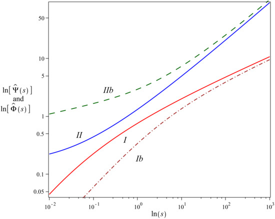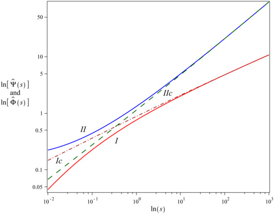 - In case of the HN relaxation we haveFor large s the leading asymptotic term of is . For small s the relevant asymptotics is got if we rewrite as the series whose first two terms (i.e., the terms with and ) give the asymptotics of proportional to . Gathered together the asymptotic behavior of readswhich determine the asymptotics ofAs in the previous example also here and are CBFs for . The power-law asymptotics given by Equation (17) for shows that in order to match the relations of exponentials has to be satisfied. It means that may be chosen arbitrarily if simultaneously . Thus, the small s asymptotics of becomes incompatible with the asymptotics of and matches it only for which is the condition reducing the HN pattern to the CC one. Figure 2, with , , and , shows that for large and fit well and , respectively, but the matching breaks down for small .