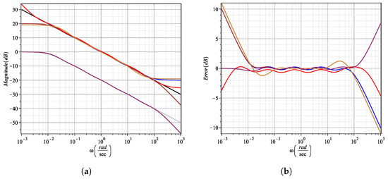 Ideal behavior (black line), Oustaloup’s (blue line), refined Oustaloup’s (red line), Charef’s V1 (brown line), ideal behavior (gray line) of (26), Charef’s V2 (maroon line) and Carlson’s (gold line) approximation for . (a) Magnitude response. (b) Magnitude error. (c) Phase response. (d) Phase error.