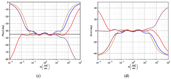Magnitude and phase responses of reduced order transfer functions by applying Pade’s approximation. (a) Ideal behavior (black line) of , Oustaloup’s (blue line), refined Oustaloup’s (red line), Charef’s V1 (brown line), ideal behavior (gray line) of , Charef’s V2 (maroon line) and Carlson’s (gold line), (b) ideal behavior (black line) of , Matsuda’s (blue line), continued fraction expansion (red line), curve fitting (brown line) and MSBL (maroon line), (c) phase responses of (a,d), phase responses of (b).
