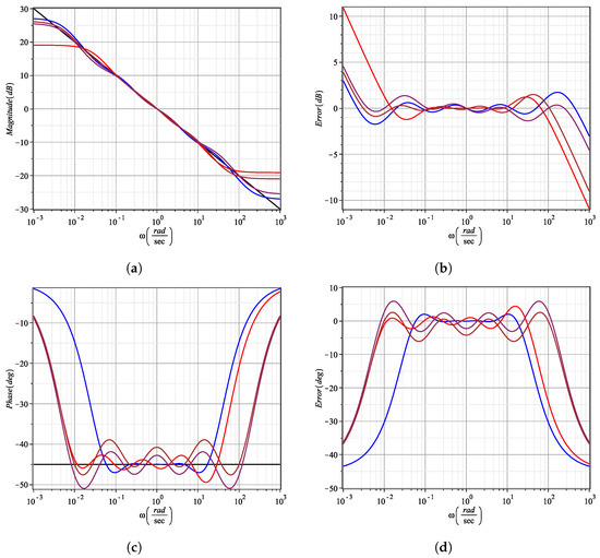 Ideal behavior (black line), Matsuda’s (blue line), continued fraction expansion (red line), curve fitting (brown line) and MSBL (maroon line) approximation for . (a) Magnitude response. (b) Magnitude error. (c) Phase response. (d) Phase error.