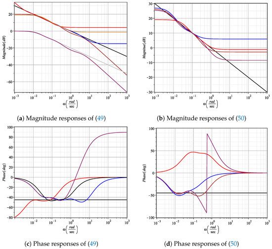 Magnitude and phase diagrams of reduced order transfer functions by applying stochastic balancing method. (a) Ideal behavior (black line) of , Oustaloup’s (blue line), refined Oustaloup’s (red line), Charef’s V1 (brown line), ideal behavior (gray line) of , Charef’s V2 (maroon line) and Carlson’s (gold line), (b) ideal behavior (black line) of , Matsuda’s (blue line), continued fraction expansion (red line), curve fitting (brown line) and MSBL (maroon line), (c) phase responses of (a,d), phase responses of (b).
