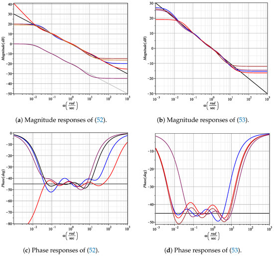 Similarly as before, the stochastic balancing method is applied to reduce an order in each numerator and denominator of the original transfer function. Thus, whereas the magnitude responses of (52) are depicted in Figure 5a, those of (53) are illustrated in Figure 5b. At this stage, one can observe that for Oustaloup’s and refined Oustloup’s methods, the bandwidth is slightly kept in the desired frequency range. However, for phase responses, the bandwidth of all approximation methods is reduced, as shown in Figure 5c,d.