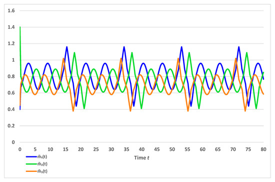Additionally, Theorem 2 guarantees that the almost periodic solution of the impulsive fractional GRNs (20) is globally Mittag–Leffler stable. The almost periodic trajectories of the state variables , for are shown on Figure 1 and the almost periodic trajectories of the state variables , for are shown on Figure 2.