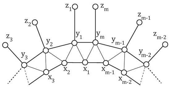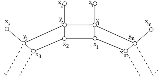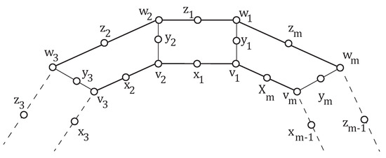 As defined in [19], for m a quadrangular circular ladder (QCL) Q m 1 is a cubic network that is the network obtained after the Cartesian product of P 2 × C m . A subdivided QCL denoted by SQ m is formed after applying the subdivision operation on QCL by adding vertex x s between vertices v s and v s + 1 , y s between vertices v s and w s and z s between vertices w s and w s + 1 . It can be seen that subdivided QCL is a bipartite network. The sets V ( SQ m ) and E ( SQ m ) are given by: V ( SQ m ) = { v j r | 1 j s } { w j | 1 j s } { w j | 1 j s } { x j | 1 j s } { y j | 1 j s } { z j | 1 j s } and E ( SQ m ) = { x s v s + 1 | 1 s m v m + 1 = v 1 } { x s v s | 1 s m } { w s y s | 1 s m } { v s y s | 1 s m } { w s z s | 1 s m } { w s z s 1 | 1 s m z 0 = z m } respectively. The subdivided QCL is shown in Figure 1.