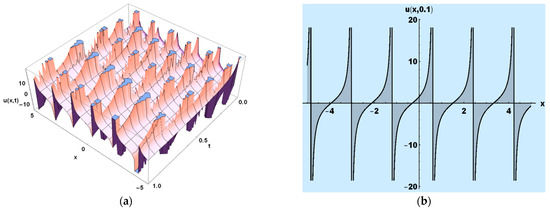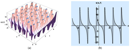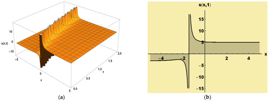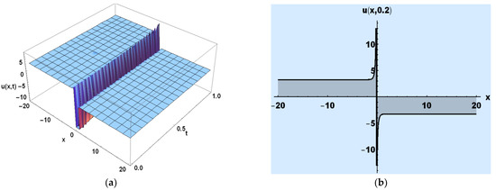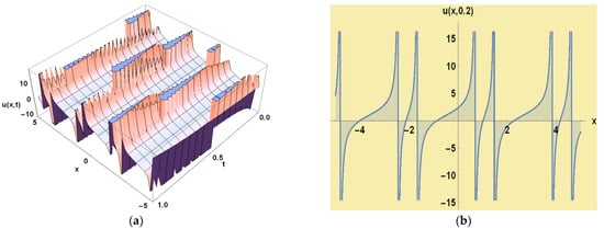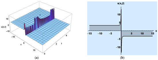The 2D solution graphs, representing a relation among u(x) and x, of is represented on of and on of on of on and of on respectively. The solutions are singular periodic wave solution, and singular kink shape soliton, which are all generic solitary wave solutions. The solutions (19), (22) and (25) provide singular periodic wave solutions while, the solutions (20), (23), and (26) provide singular kink shape wave solutions, and the solutions (21), (24), and (27) provide rational solutions, according to the aforementioned solutions. Figure 1a,b represents the singular periodic wave solution, which is spatiotemporal oscillations with discontinuous derivatives of in Equation (19) for the parameters values in 3D and 2D. The Figure 2a,b and Figure 3a,b are similar to Figure 1a,b for different values of the parameters. Figure 4a,b represents the 3-dimensional and 2-dimensional singular kink wave solution in Equation (20) for the parameters values . Figure 5a,b and Figure 6a,b are similar to Figure 4a,b for different values of the parameters.