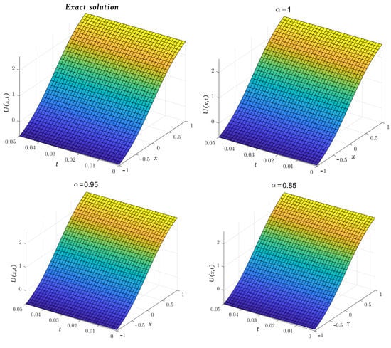 In Table 1 and Table 2, the MGMLFM approximate solutions of Example 1 are shown for various values of α and compared with the exact solution. The tabled results below seem to coincide with the values of the exact solution (18), which means that the MGMLFM is a more accurate technique than those methods that give a solution as an infinite series.