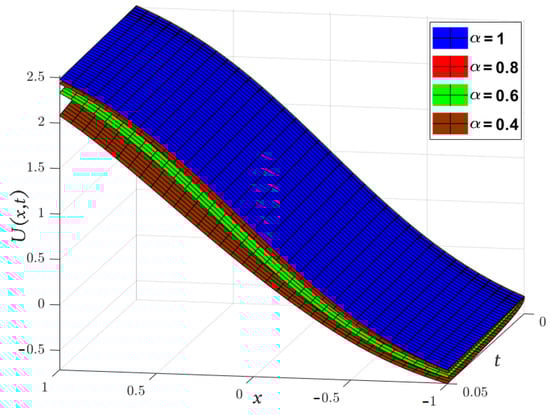 In Figure 1 and Figure 2 the LADM approximate solutions of and at various values of α are plotted in the domain ; Moreover, a 3D graph with comparative results at is shown.