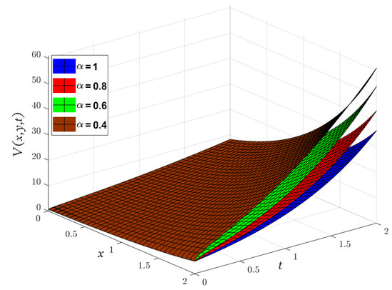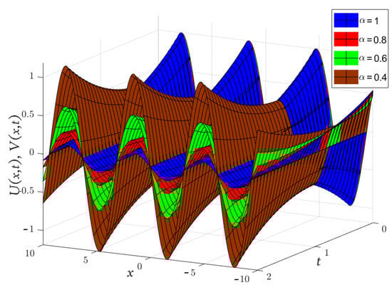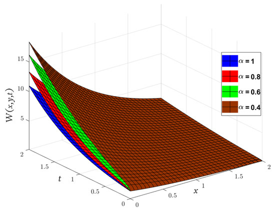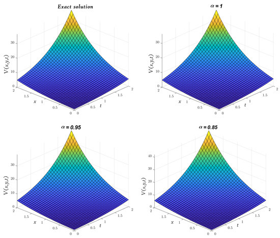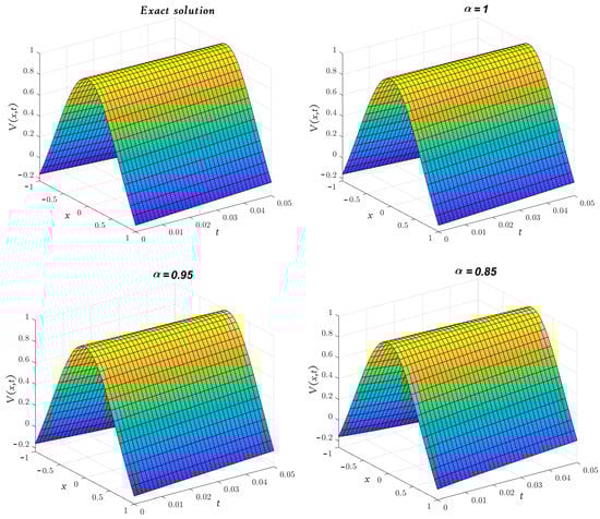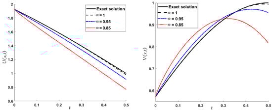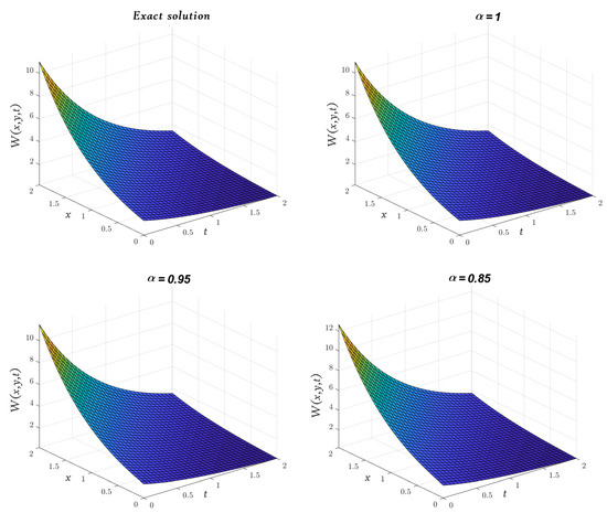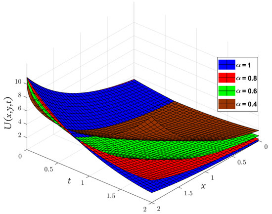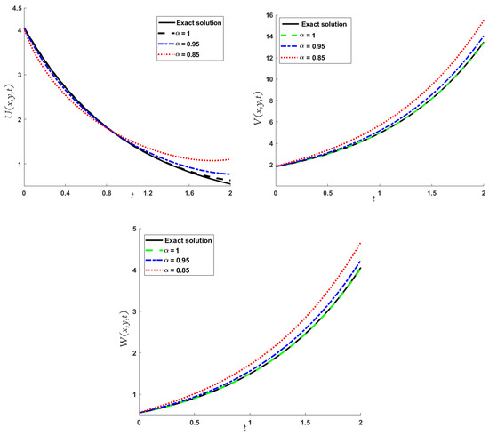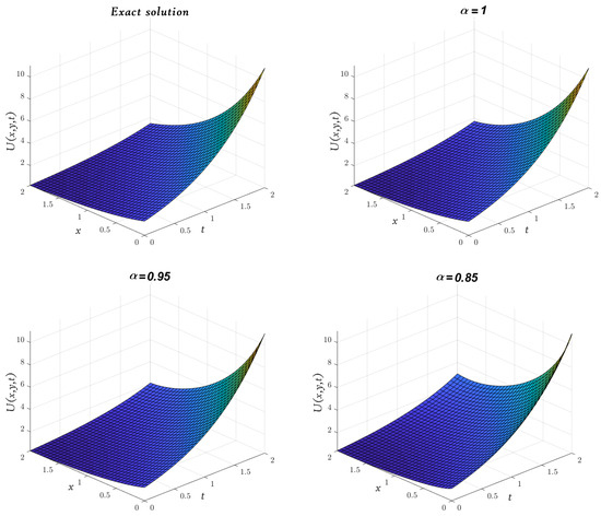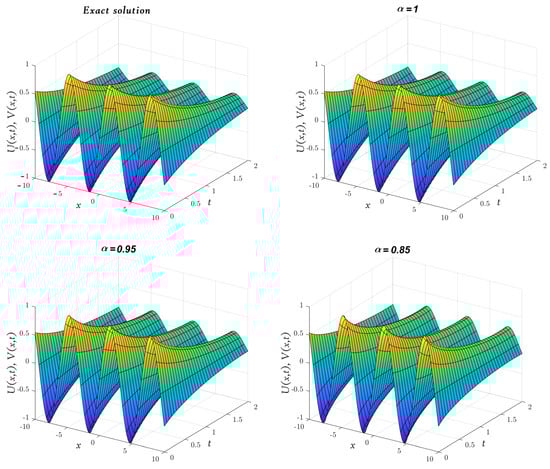 Obviously, the results in Table 3 are very close to the exact solution shown earlier in Equation (29) when which means that the approximate solutions obtained by the MGMLFM are rapidly converging to the exact solutions. Now, the LADM solutions for system (3) with ICs (4) are illustrated by the following simulation.