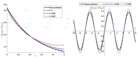 Further, in Figure 5, we display the comparison between exact and approximate solutions in two dimensions with time (right figure) and with various values of space (left figure). Finally, it is noticeable that the LADM and MGMLFM approximate solutions overlap (for any interval of the variables ) and have a high degree of accuracy when compared to the exact solution.