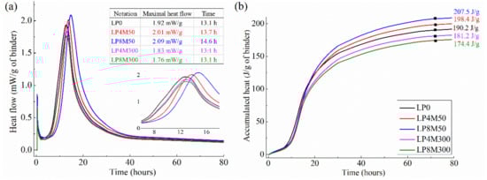 On the contrary, the addition of M300 could neither prolong the induction stage of LHP cement or increase its hydration heat. Specifically, Figure 1a shows that, the end time of induction period and the occurrence time of the maximal heat flow of LP4M300 and LP8M300 are almost the same with that of the LP one, but the maximal heat flow value is reduced by some degrees. Moreover, Figure 1b shows that the accumulated hydration heat of LP4M300 and LP8M300 are about 4.7% and 8.3% lower than that of the LP one, respectively. The reduced hydration heat is proportional to the dosage of M300. These results indicate that M300 seems to act as an inert material at the early stage of cement hydration. This trend has also been reported by other studies [,]. Mo et al. [] reported that the hydration degree of M300 with water is only 4.5% at 2 days and 9.9% at 7 days. Thus, the reduced amount of cement due to the dilution effect of M300 is the main reason for the reductions in both the maximal heat flow and accumulated hydration heat.