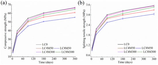 Regarding the effects of MgO reactivity, Figure 2 shows that in comparison with M300, the addition of more reactive M50 tends to reduce the mechanical property of LHP concrete to a greater extent at all periods studied. The compressive strength of LC8M300 at 3, 28, 180, and 360 days was 10.1%, 8.4%, 4.2%, and 2.8% lower, respectively, as compared to the LC0 one, while the compressive strength of LC8M50 at 3, 28, 180, and 360 days was 16.9%, 16.0%, 16.4%, and 16.8% lower than those of LC0. The same trend can be found for LC4M300 and LC4M50 and for the splitting tensile strengths in Figure 2 as well the results in other study []. Cao et al. [] reported that the more reactive the MgO is, the larger the strength reduction of concrete is. Thus, it can be deduced that the replacement of cement by MgO is the main reason for the strength reduction of concrete containing M300, since M300 cannot participate the reaction at early age. As Mo et al. [] showed, the 7-day reaction degrees of less reactive MgO (325 s) and reactive MgO (46 s) are about 10% and 100%, respectively. Apart from the replacement of cement, M50 could consume more free water and react with water considerably at an early age, resulting in larger strength reductions.