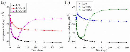 In addition, Figure 3 clearly shows the first inflexion points of LC4M300 and LC8M300 occur at about 50 days, which is much later compared with those of LC4M50 and LC8M50. This is because the weak reactive M300 begins to react with water at middle age, as discussed above. After the first inflexion points, the autogenous shrinkage curves of LC4M300 and LC8M300 start to climb up until the hydration age of 180 days when they reach a relatively constant value. It can be seen that there is a very long duration of compensation effect for M300. From then on, the curves of LC4M300 and LC8M300 stay rather flat between 180 days and 360 days. At 360 days, about 88% and all of the autogenous shrinkage can be eliminated resulting from the addition of 4% and 8% M300, respectively. These results are similar to those found by Mo et al. [], who reported that more time is needed for the expansion curve to become flat when the MgO reactivity is weak. Moreover, LC4M300 and LC8M300 do not show the second inflexion points in their autogenous shrinkage curves. This is because even though the compensation effect of M300 disappears at long-term hydration age, the shrinkage caused by cement hydration is small at the same time; as a result the concrete would not exhibit obvious shrinking trend at late age.