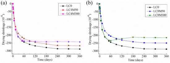 The results in Figure 4 also show that M50 achieves its maximum compensation effect (i.e., the largest expansion due to MgO hydration) between 10–14 days, when approximately 12.0% (19.7 × 10−6) and 24.6% (40.6 × 10−6) of drying shrinkage of LC0 concrete could be reduced after the addition of 4% and 8% M50, respectively. Afterwards, no more drying shrinkage can be compensated by M50, both LC4M50 and LC8M50 present quite similar shrinking behavior to the LC0 until 360 days, when the drying shrinkage of LC4M50 and LC8M50 are 7.2% and 13.5% lower than that of LC0, respectively. In contrast, Figure 4b indicates that the shrinkage curve of LC8M300 steadily climb up until 180 days, indicating M300 exhibits a much longer duration of compensation effect than M50. Thereafter LC8M300 maintains a nearly constant shrinkage value until 360 days. Finally, about 16.0% and 25.5% of the 360-day drying shrinkage is reduced by adding 4% and 8% M300, respectively. Similar compensation effects of MgO have been observed on cement mortars reported by Cao et al. [,,].