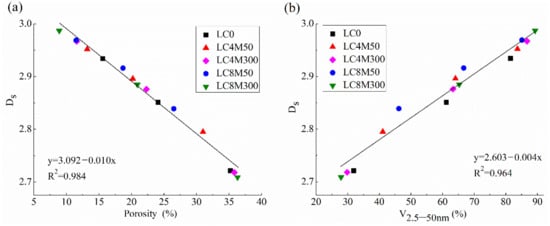 Figure 5a indicates that Ds is negatively correlated with the porosity of LHP concrete with a high R2 value of 0.98. This trend is in good agreement with previous findings [,,,,,]. Additionally, Figure 5b indicates that Ds exhibits a negatively linear correlation with V2.5–50 nm, and the R2 between them is 0.964. The results indicate that the pore structure of LHP concrete can be studied by Ds. As Jin et al. [] stated, Ds can perform more accurately and comprehensively than other pore structure parameters to characterize the overall situations of pore structures.