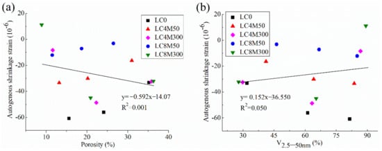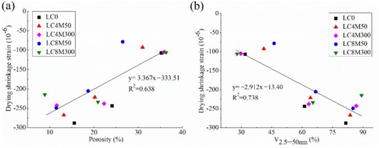 The correlation between autogenous shrinkage and pore structure (porosity and V2.5–50 nm) was plotted in Figure 6. The correlation between drying shrinkage and pore structure is shown in Figure 7.