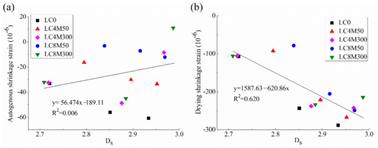 Figure 5 reveals the correlation between pore structure of concrete and Ds. The relationship between Ds and the porosity can be seen in Figure 5a. Many researchers confirmed that the fine pores less than 50 nm dominantly affect the shrinkage behavior of concrete [,,,,,,,]. The V2.5–50 nm values estimated from Table 4 are shown in Table 7. The relationship between Ds and V2.5–50 nm is displayed in Figure 5b.